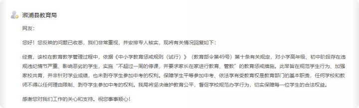 该校在教养教学惩处经过中,依据《中小学教养惩责功令(试行)》(教养部令第49号)第十条干系规矩,对小学高年事、初中阶段存在违规非法情节严重、影响恶劣的学生,施行“不跳跃一周的停课,并条款家长在家进行教养、管教”的教养惩责措施。