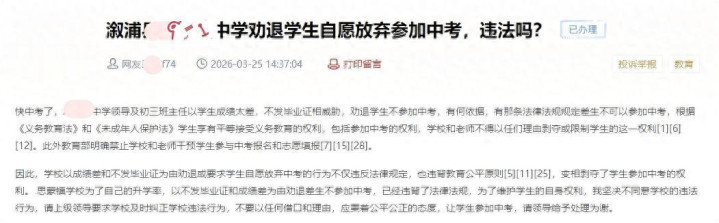 这位网友反应称,周边中考,怀化市溆浦县某中学的带领及初三班主任以学生获利太差、不发毕业证相要挟,劝退干系学生。