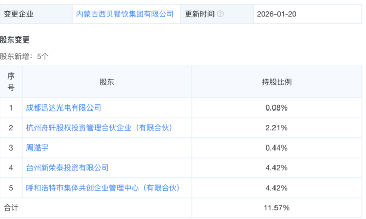 天眼查工商信息显示,内蒙古西贝餐饮集团有限公司(简称西贝餐饮)近日获得新投资。资方包括台州新荣泰投资有限公司、呼和浩特市集体共创企业管理中心(有限合伙)、成都迅达光电有限公司、杭州舟轩股权投资管理合伙企业(有限合伙)等,涵盖餐饮、科技、投资等领域。