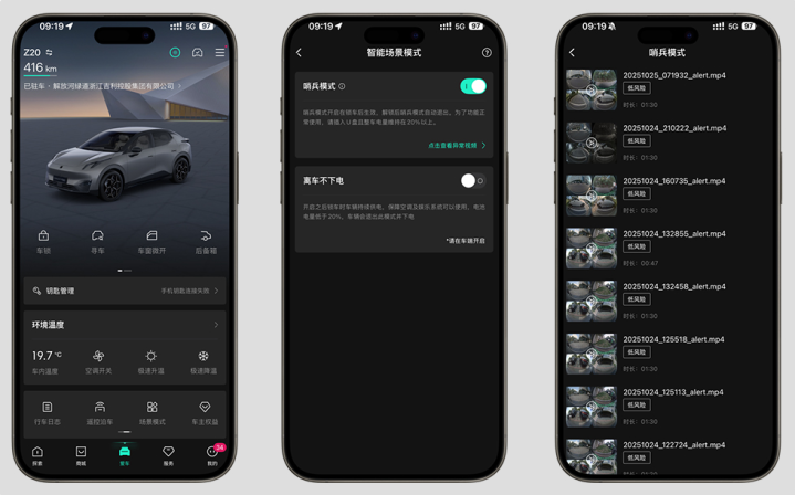 场景化功能的优化则让用车体验更显贴心,宠物模式的加入精准契合了养宠群体的需求。当车主临时离车且宠物留在车内时,该模式会自动开启离车不下电、空调外循环,关闭小窗并屏蔽状态栏与任务栏,中控屏同步显示宠物关怀界面,全方位保障宠物在车内的舒适与安全,化解车主的后顾之忧。同时,哨兵模式的升级进一步强化了车辆安防,车辆异常触发监控后,视频会按时间倒序排列并区分高、低风险类别,云端分别保留10条对应记录,更多视频可在车机内查看,为车辆安全筑起可靠防线。