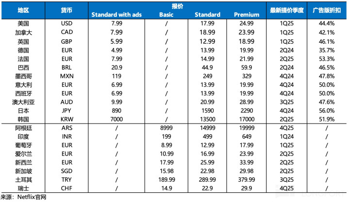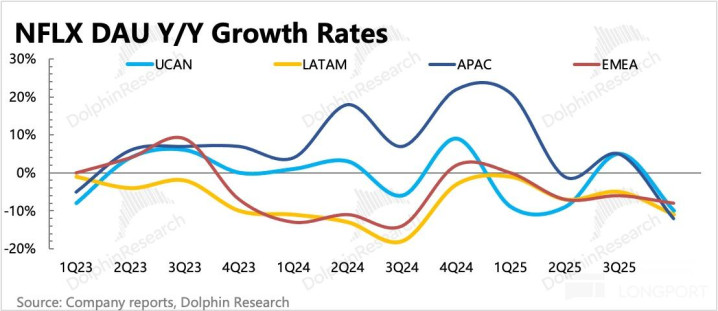 虽然过去一年,Netflix 在国际地区(主要是亚洲)用户增长有良好势头,但无奈人均付费单价不足北美一半,因此短期增长还得靠在成熟市场的垄断优势下涨价。25 年初北美、欧洲地区的陆续涨价,在四季度年末看到了明显的涨价效应。而在非成熟地区,涨价则很容易打压用户规模的增长趋势,因此 Netflix 涨价频次不高。4Q25 当季主要针对阿根廷地区一年内第三次涨价,这纯粹是为了缓冲汇率影响。