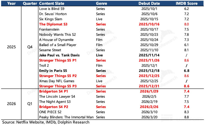 (1)对于今年一季度,海豚君认为虽然是淡季,但可能会因为有《Bridgerton》第四季的播出而有淡季不淡的表现,再加上《Stranger Things》去年底较晚播出,热度有望在年初继续保持。