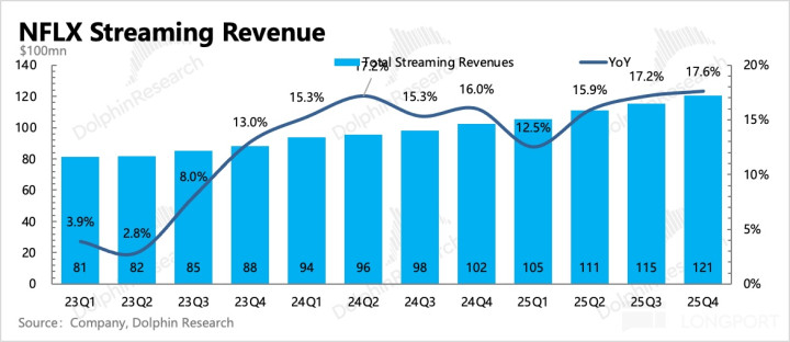 3. 广告进展偏慢,今年或有转机:2025 全年广告收入超 15 亿,虽然符合海豚君此前预期,但和不少机构动辄 20-30 亿的预期相比,差距还是明显。大环境固然有影响,尤其是对于 Netflix 偏传统销售方式的品牌广告而言。目前 Netflix 正在北美地区测试程序化广告,下半年进一步推广到全球,预计会给广告带来一次比较明显的规模扩张。