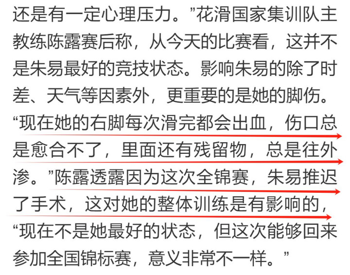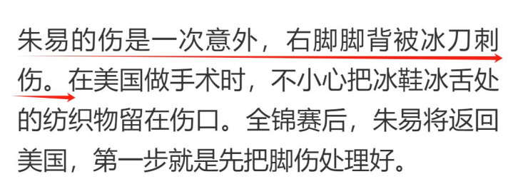 在赛前训练时,朱易的右脚被冰刀意外戳伤,伤口里还残留着纺织物。