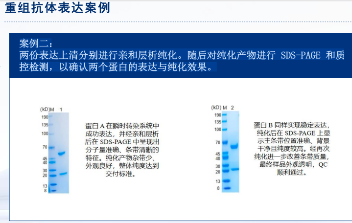 重组抗体抒发案例:展示从序列到高纯度、构象正确产物的完满经过,包括SDS-PAGE质控与亲和层析纯化成果。
