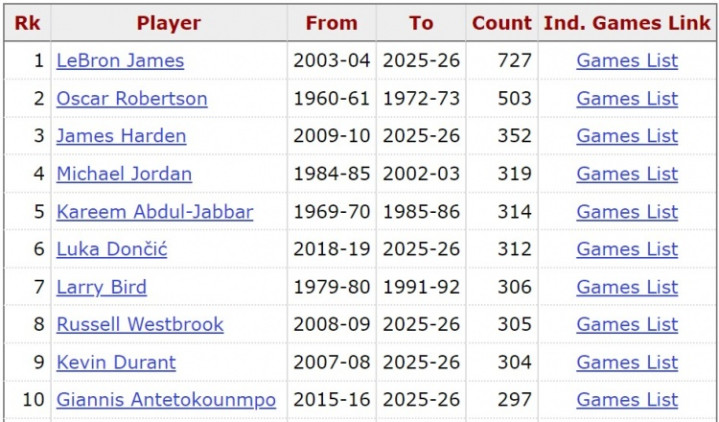当今排在KD和威少前边一位的是拉里·伯德,306场25+5+5。
