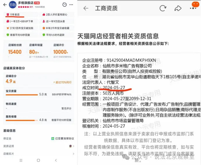更令投诉人意外的是,涉事店铺高调宣称“11年老店”,但查询其营业执照信息发现,该店铺主体为仙桃市多米格广告公司,注册时间为2024年5月27日,与“11年经营年限”的宣传严重不符。