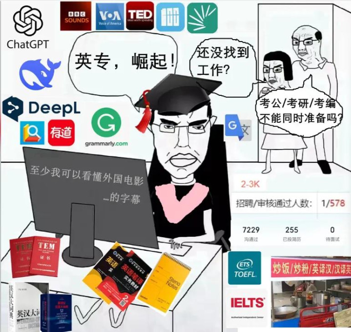 曩昔英语专科是 “香饽饽”,因为懂英语的东说念主少,岂论是翻译、外贸照旧磨真金不怕火,王人能找到可以的使命;但当今,英语也曾成了 “全民基础技巧”,光会背单词、懂语法根底没竞争力。