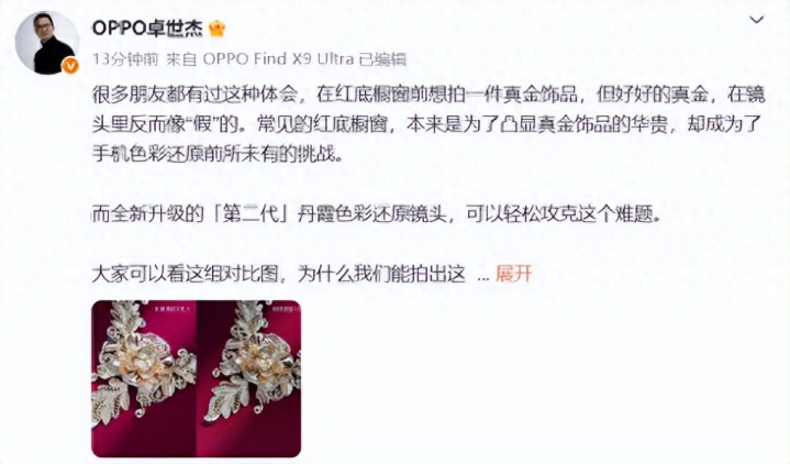 OPPO卓世杰的酬酢媒体截图 · 展示其对于Find X9 Ultra颜色复原的发言