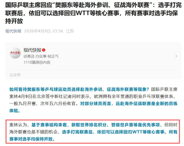 当今快报:《国际乒联主席回复“樊振东等赴国外参训、树立国外联赛”:选手打完联赛后开云app官方下载,依旧不错弃取总结WTT等中枢赛事,通盘赛事对选手均保执敞开》2026年4月9日