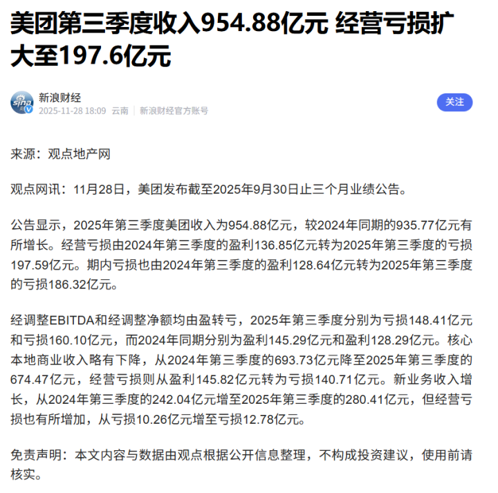 2025 年 Q3 的财报一出来,行业都炸了:美团经调整净亏 160.10 亿元,核心本地商业板块三年来首次由盈转亏,亏了足足 140.71 亿元!