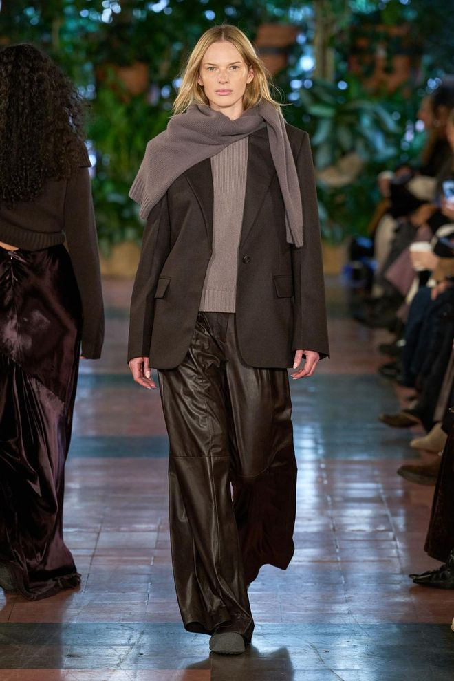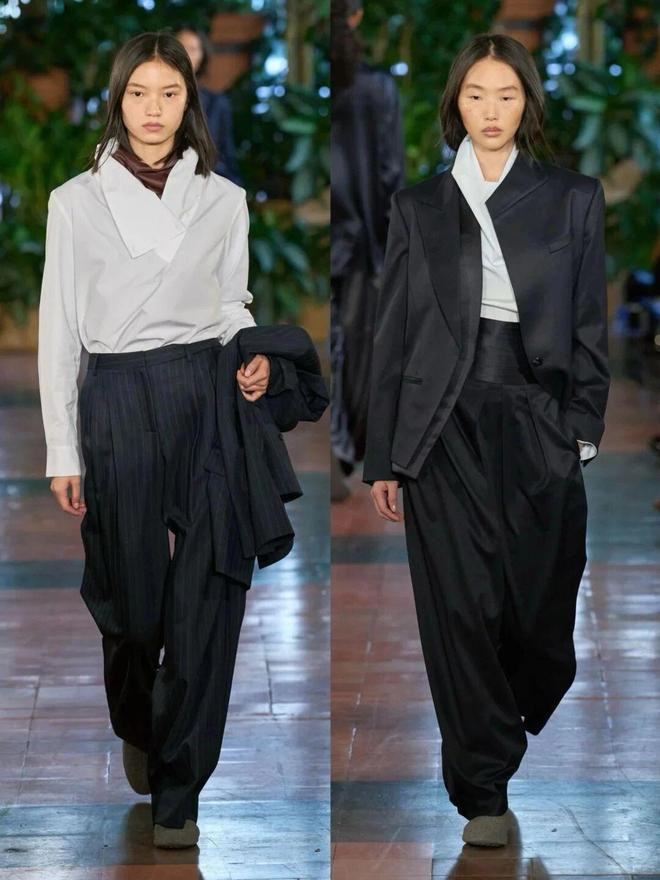 下装搭配直筒西装裤,用利落挺括的下装线条,均衡领口的柔垂感,幸免全身过于柔垮,刚柔并济,无缺契合学术文艺 + 好意思式勤俭的穿搭腔调。