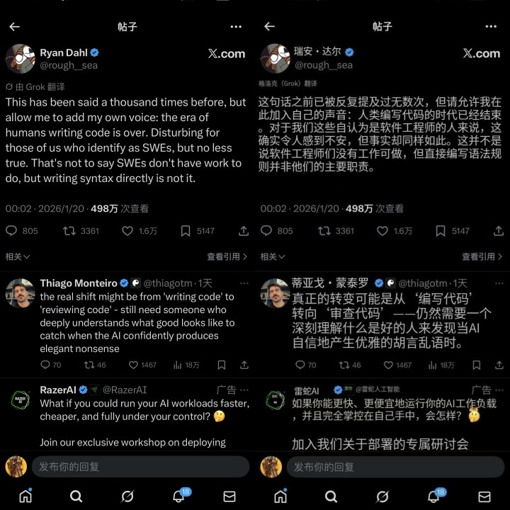 编程圈再爆颠覆性言论,Node.js创建人、Deno联合创始人公开表态,语气坚定地宣称“人类写代码的时代已经结束了”。这番话瞬间引爆程序员圈子,有人认同AI编程的崛起不可逆,也有人直言,这句话忽略了AI编程最核心的短板——看似优雅流畅,实则藏着无数隐形错误。