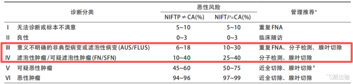 甲状腺细胞的形式复杂,有些良性结节(如结节性甲状腺肿)和某些类型的甲状腺癌(如滤泡状癌)长得太像了,仅靠细胞形式很难辞别。根据Bethesda系统(甲状腺细胞病理学陈诉系统),这类情况被归为Bethesda Ⅲ/Ⅳ类。其中,Bethesda Ⅲ类界说是兴趣不解确的细胞非典型病变(AUS/FLUS),恶性风险约10%-30%;Bethesda Ⅳ类界说是滤泡性肿瘤或可疑滤泡性肿瘤(FN/SFN),恶性风险约25%-40%(图1)[1]。